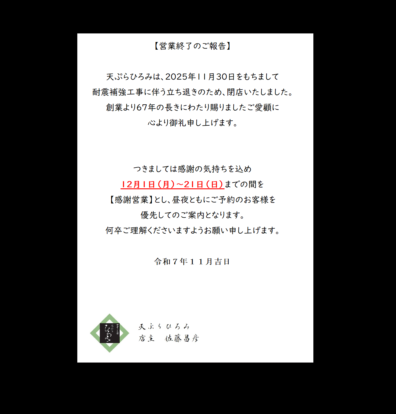 - New営業終了および、感謝営業のご案内